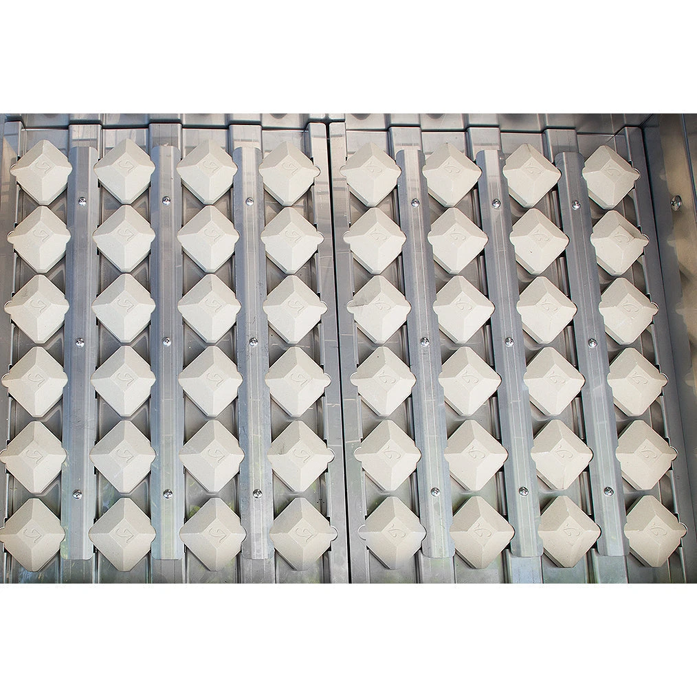 Refractive ceramic 5-way heat distributing briquettes eliminate hot and cold spots, making the effective grilling area 100% of the grilling surface. High-density composite material in a flat top pyramid-shape, with a heat-holding cavity underneath, delivers intense heat to the cooking surface.