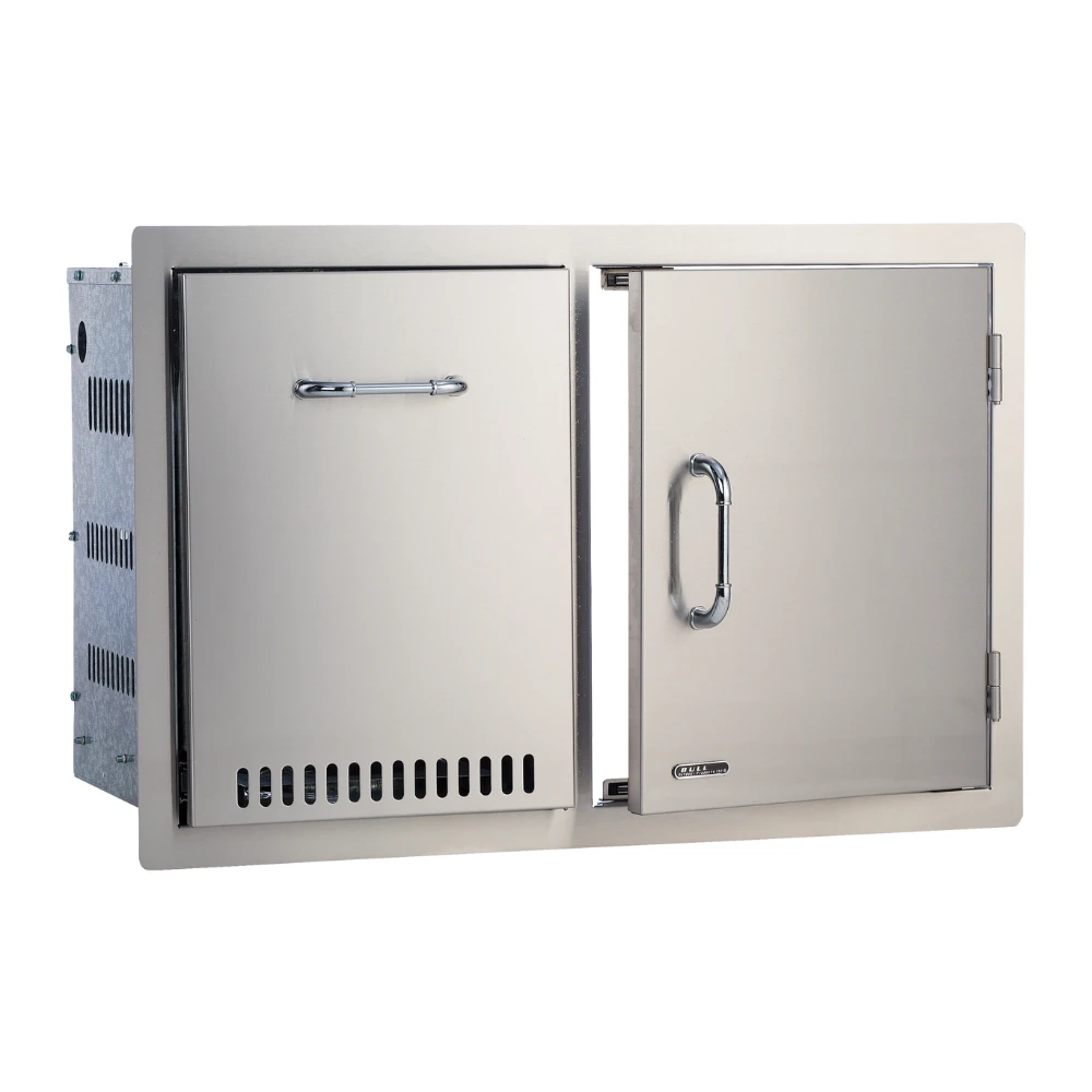 The Door/Propane Drawer Combo is stainless steel and has room to store trash or your propane tank as well as an access door to connect to your grill.